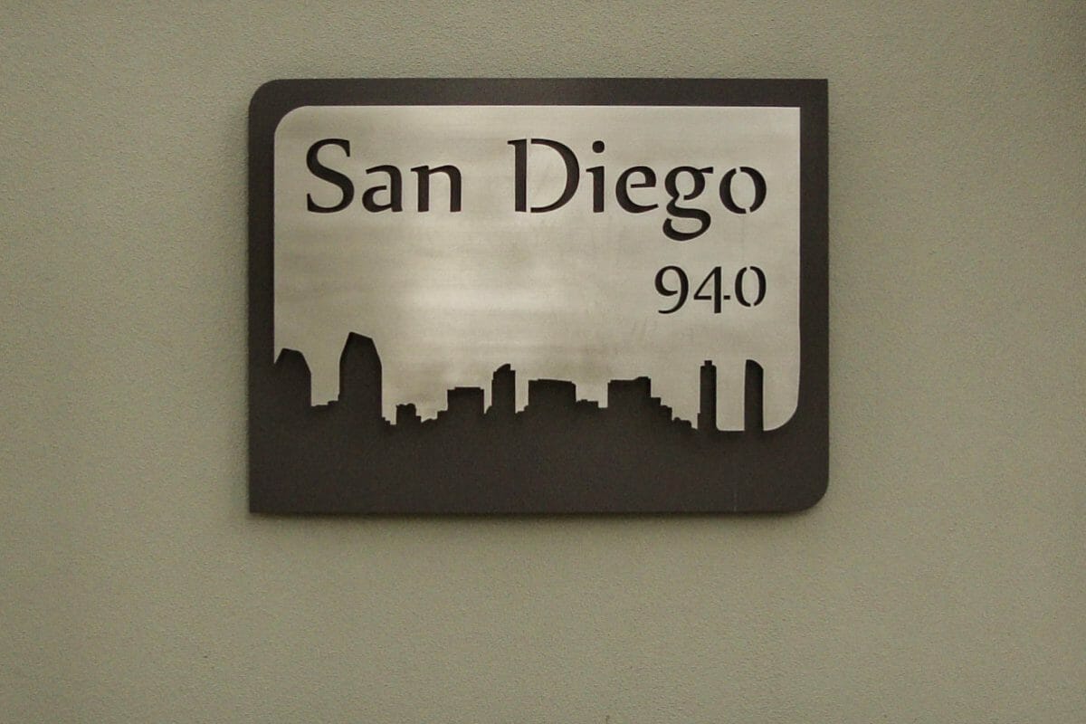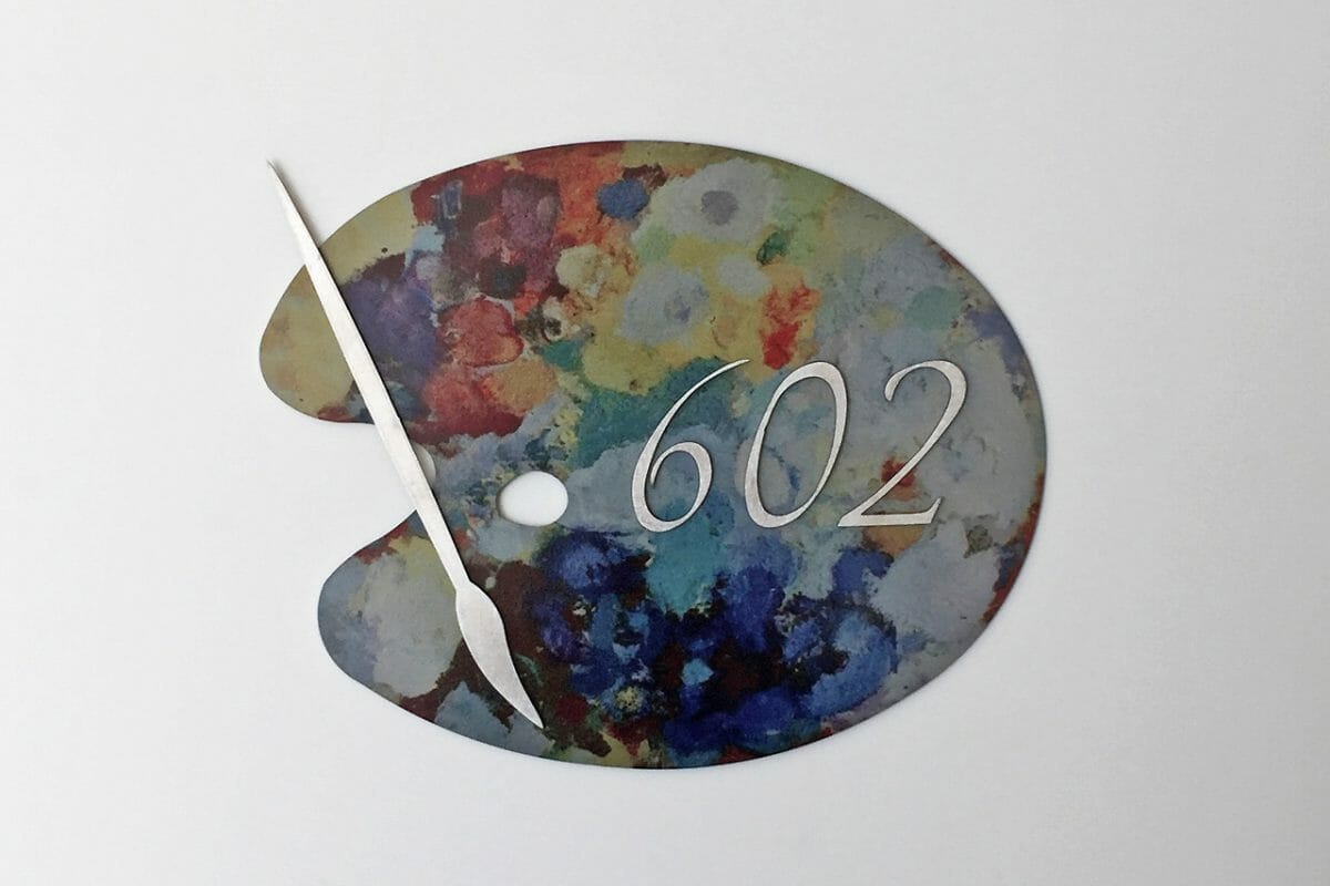Solução completa envolvent criação, execução e instalação de itens como placa de identificação de portas em alumínio com impressão digital e sobreposição de Inox.